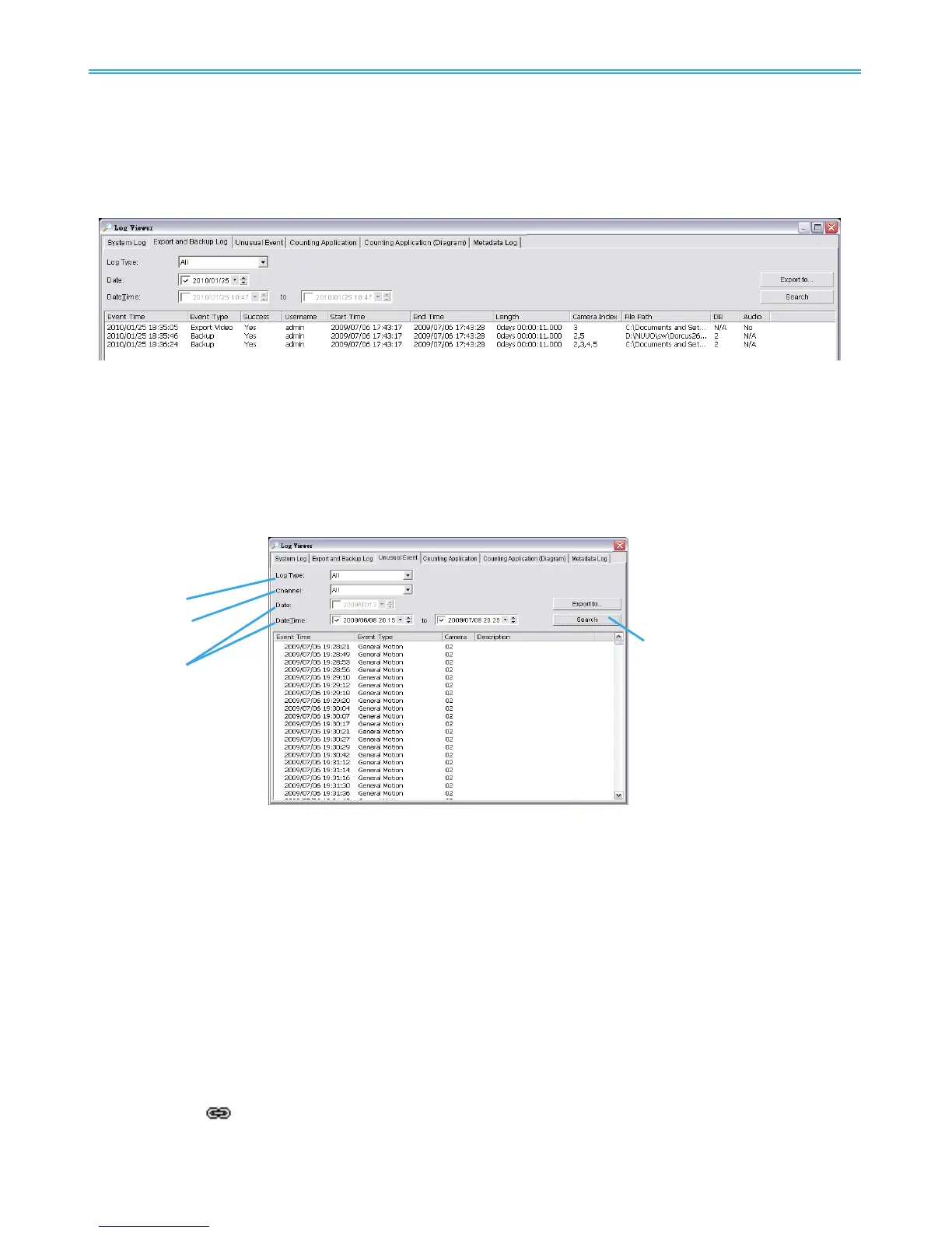 1. Log Viewer will search for Unusual Event in the video record in Date & Time mode, starting from the