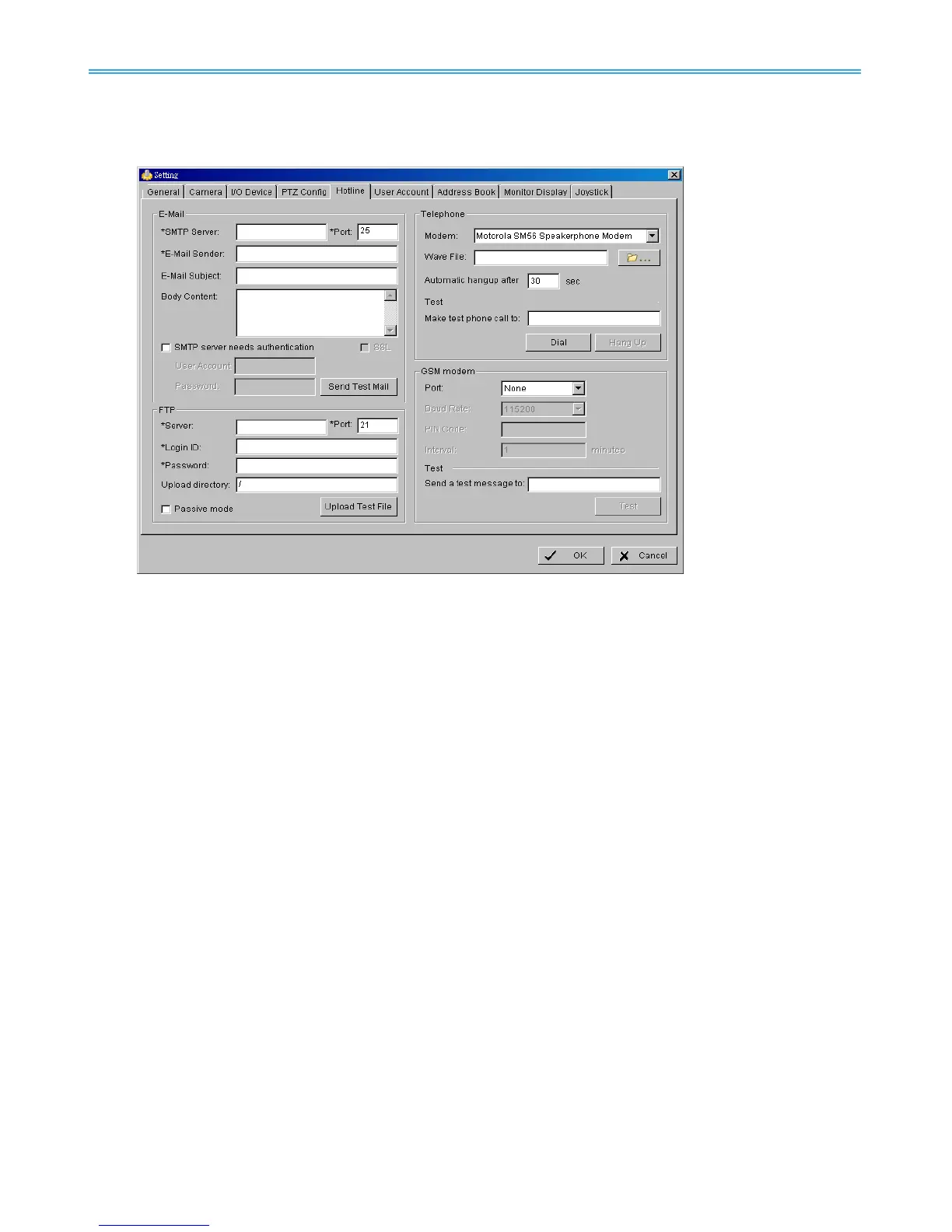 Configure the settings of various contacts or devices, including E-mail, FTP, GSM modem and Telephone calls