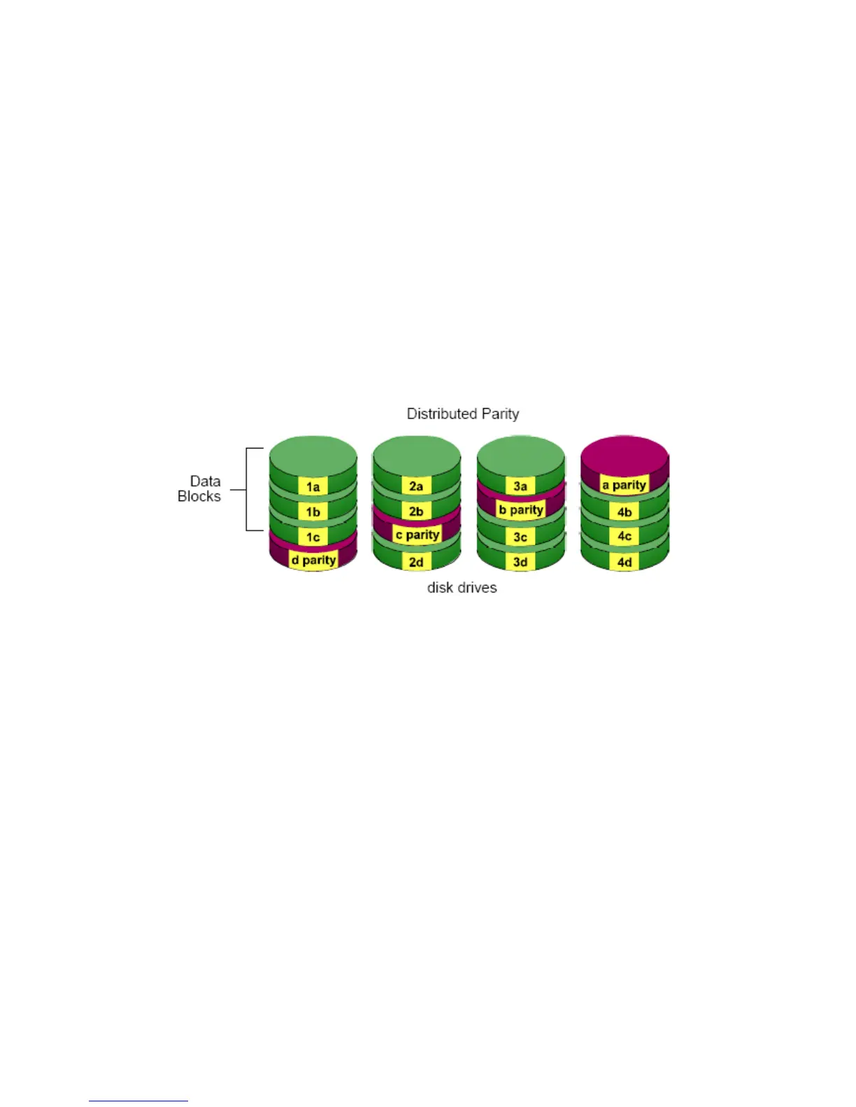 RAID 5 organizes block data and parity data across the disk drives. Generally,