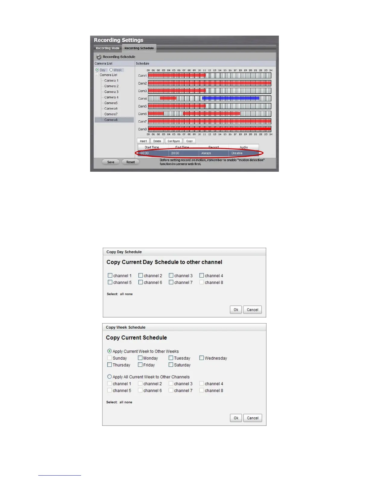 Configure: Modify the schedule and recording mode settings.