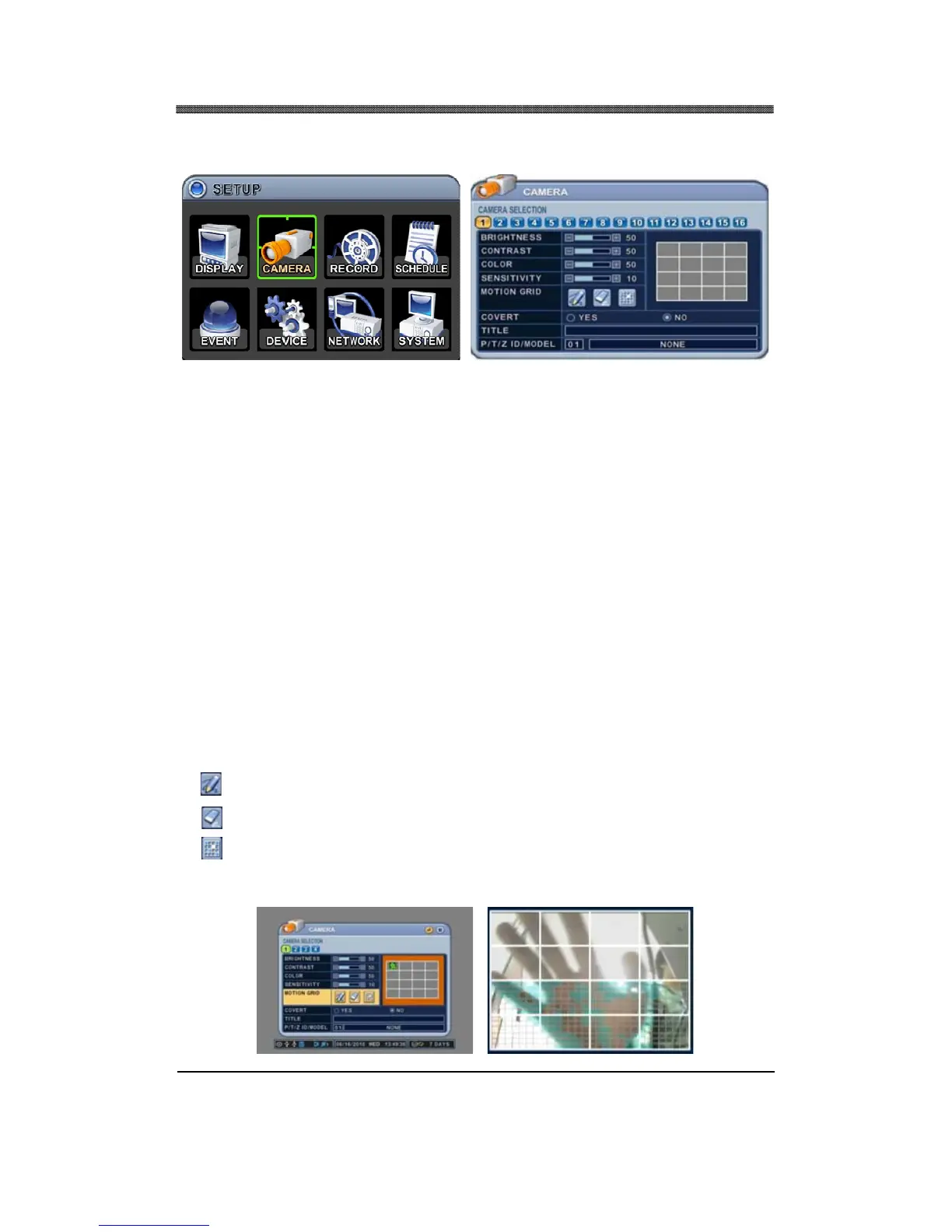 brightness, contrast, color, sensitivity, motion grid, channel title and the PTZ camera associated.