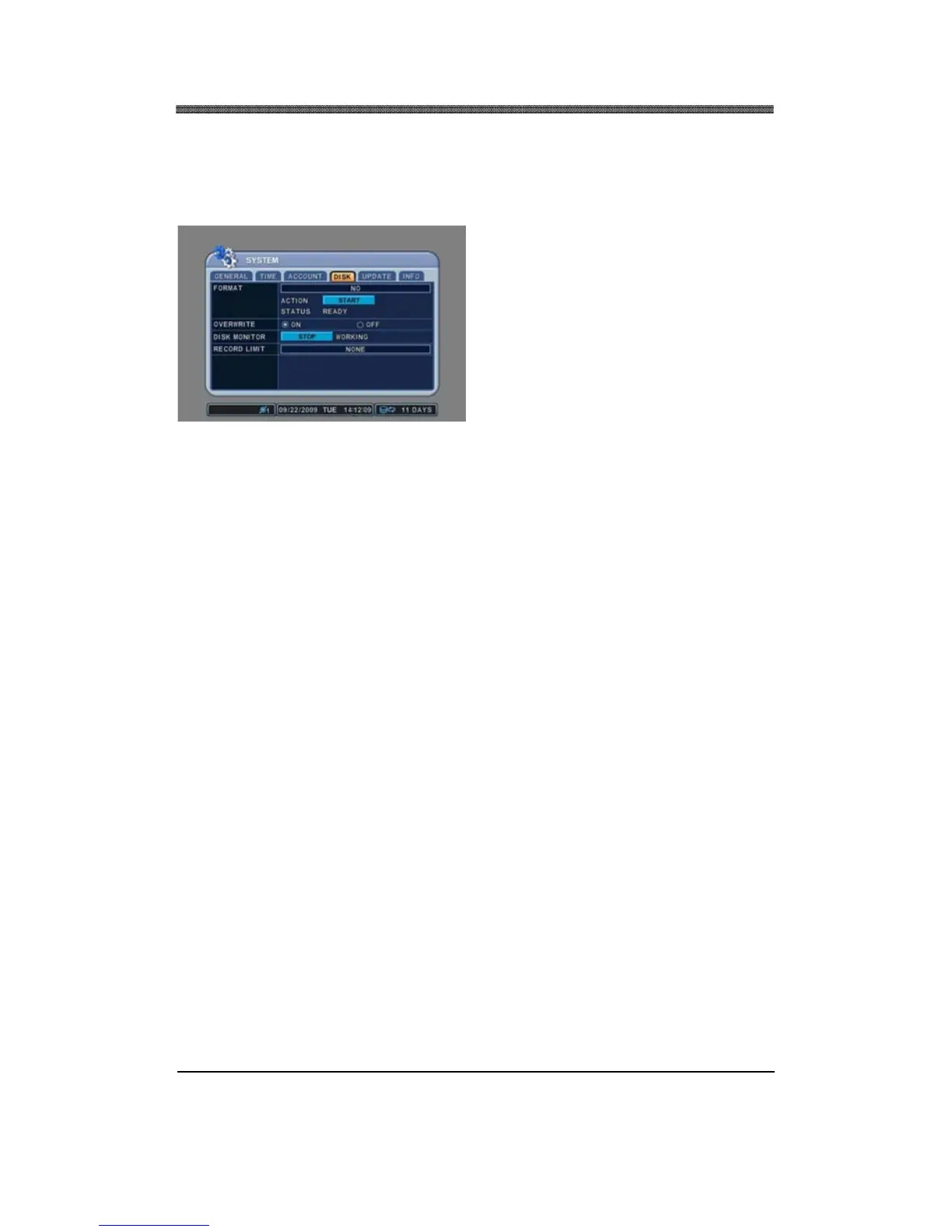 Note: STOP recording before formatting the disk and START recording after formatting the