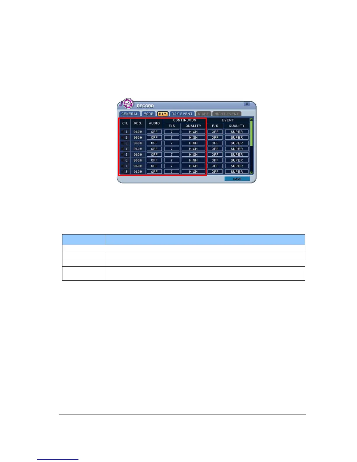 The DVR records video data continuously over 24 hour period. Recording setup is for normal