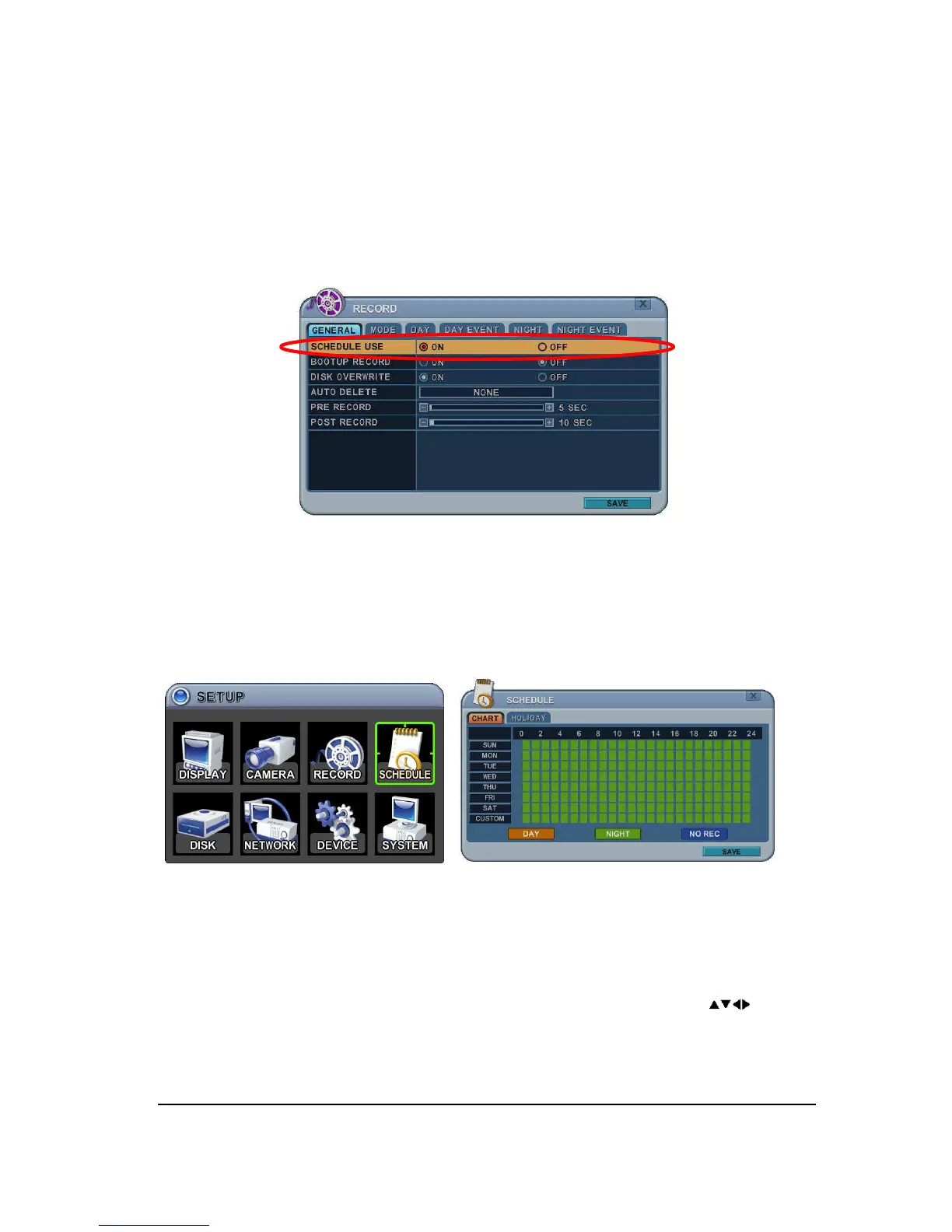 Schedule USE “on” Record setup, Night Mode will be activated.