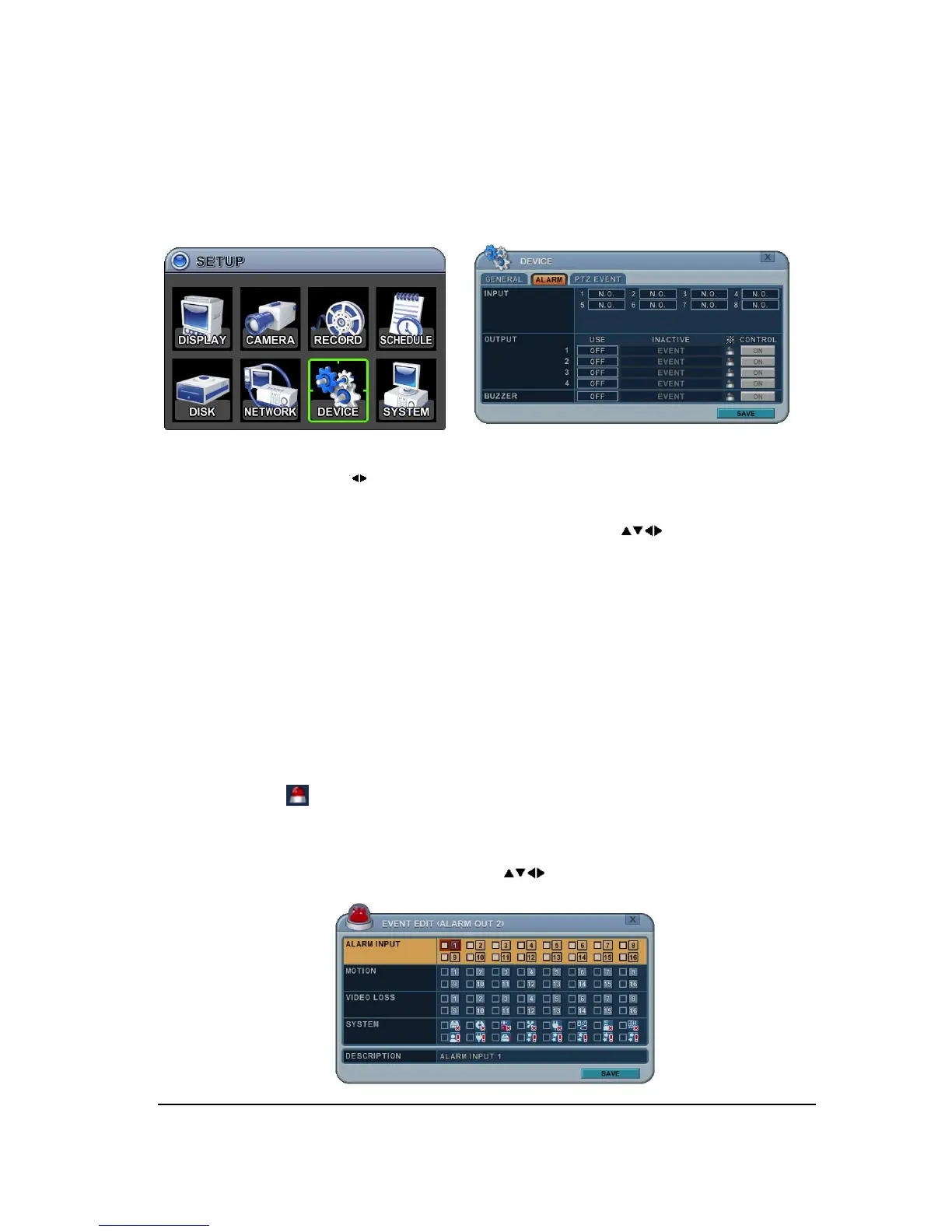 This DVR support 4 Alarm inputs and 1 relay output. One Alarm input can be configured to