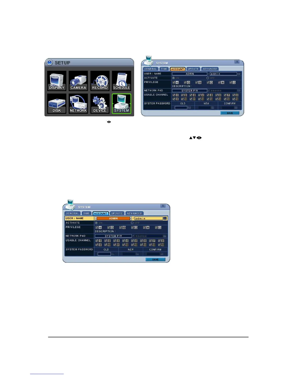 1) User/Name: DVR comes preconfigured with ADMIN. Select User 1~5, and then