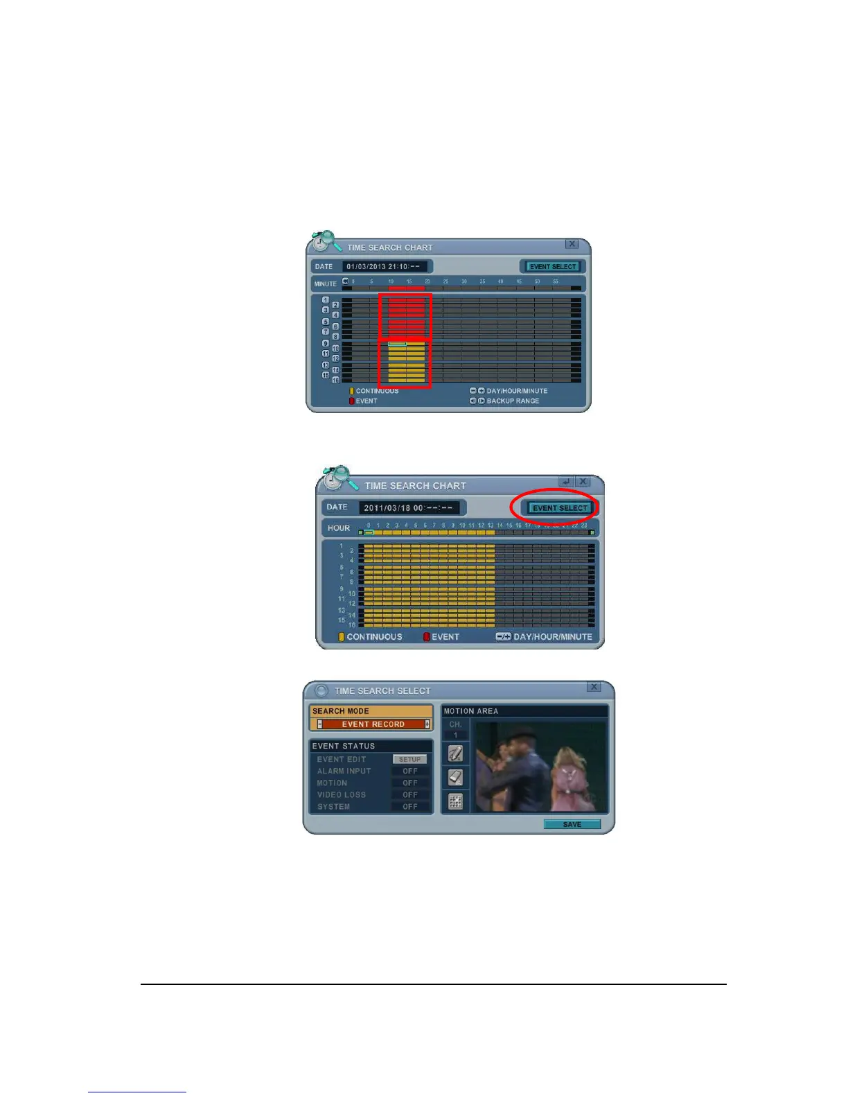 CONTINUOUS recording (Yellow) and EVENT recording (Red). TIME SEARCH CHART will