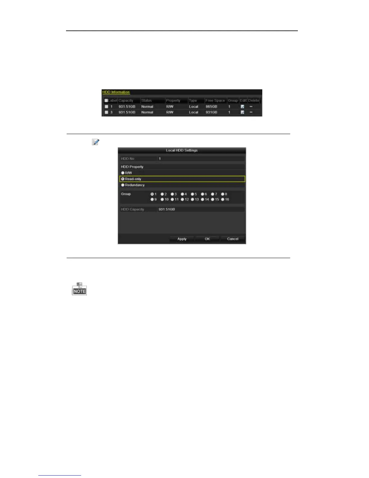 To edit HDD property, you need to set the storage mode of the HDD to Group. See Chapter 10.4 Managing