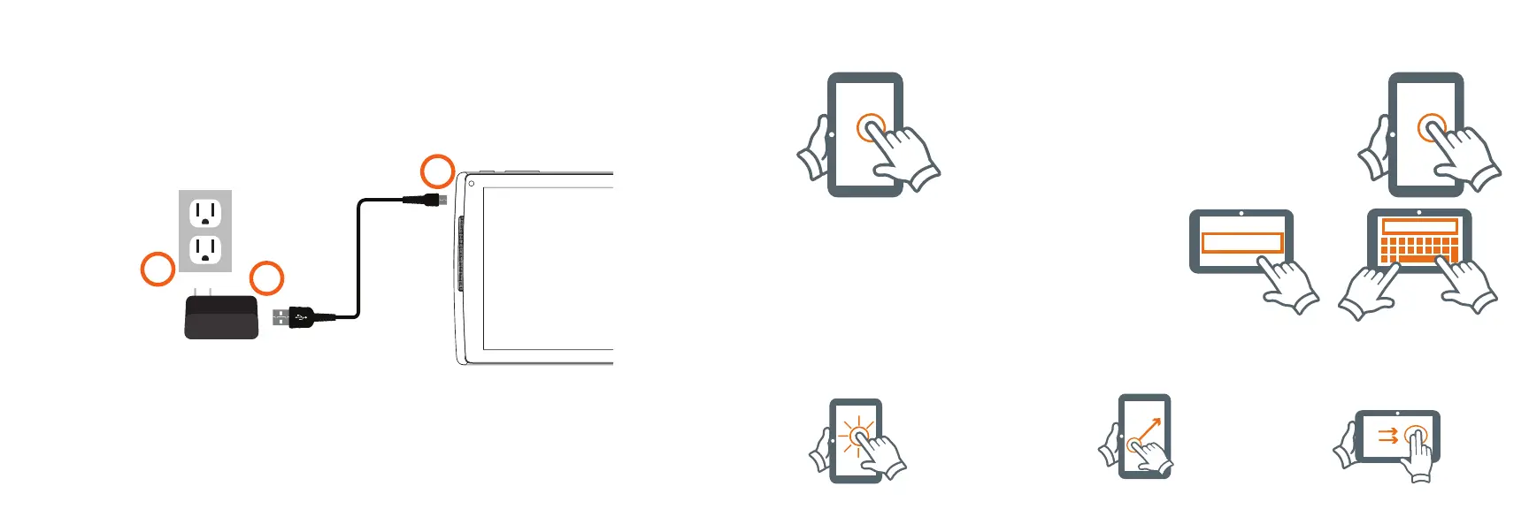 tablet, plug the 1) USB cable into the AC adapter, and 2) attach the other end to