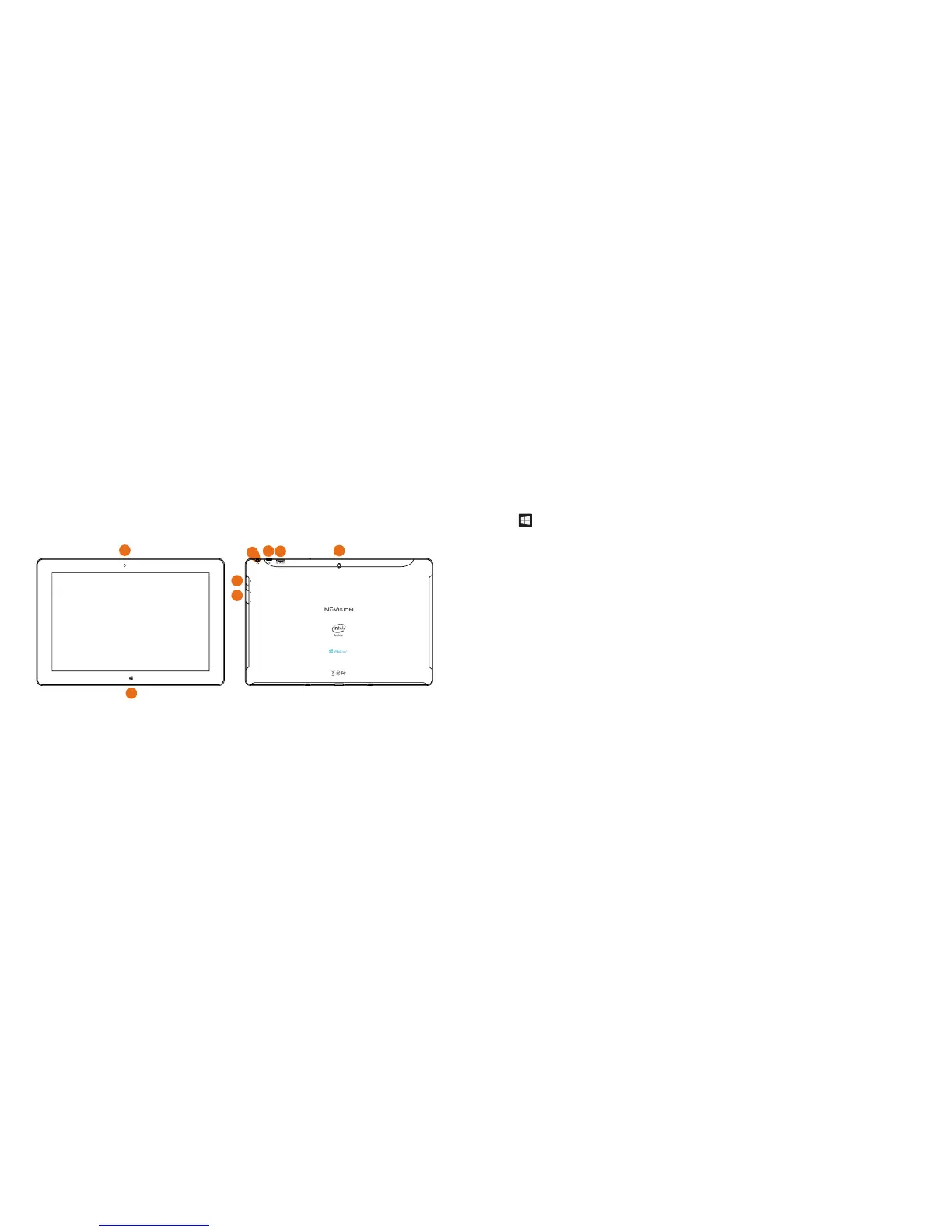 3. Power: Press and hold for 3 seconds to turn on the tablet. Press momentarily to