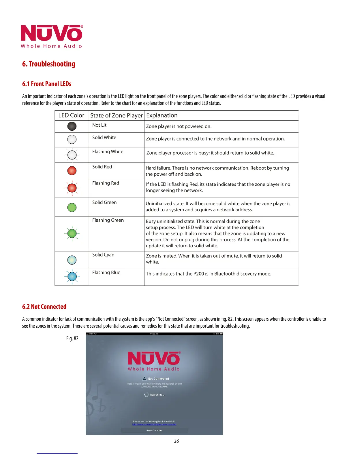 Nuvo P100 - Troubleshooting Basics; Front Panel LED Status Indicators; Not Connected App Issue Resolution