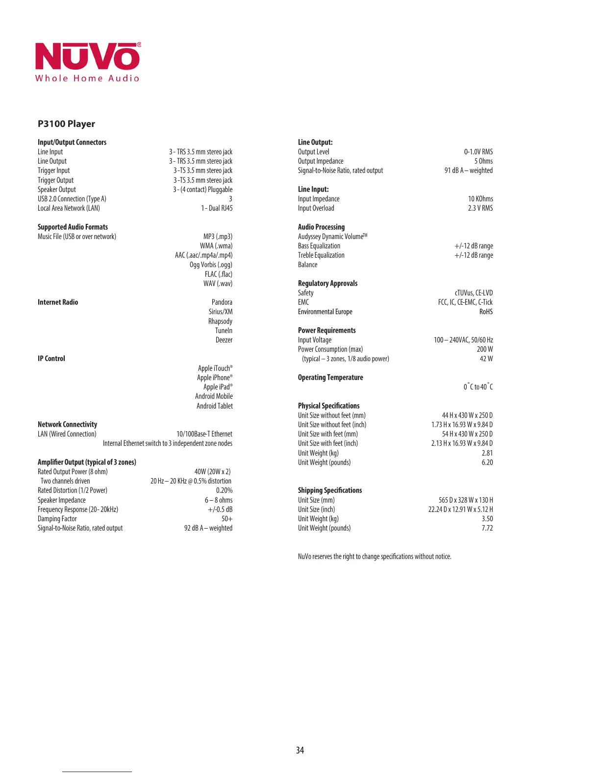 Nuvo P100 - Specifications: P3100 Player