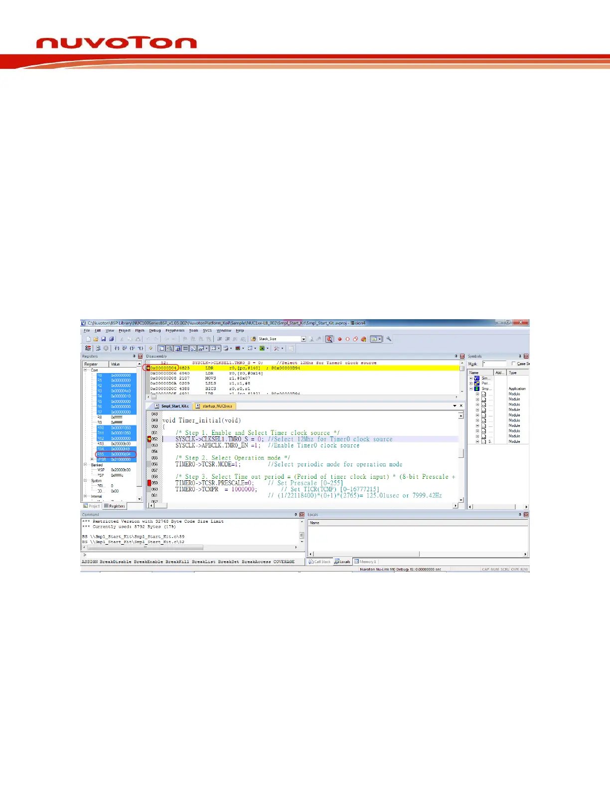 the register value of Program Counter (PC) (i.e. “R15(PC)=0x00000D04” in the Registers pane in