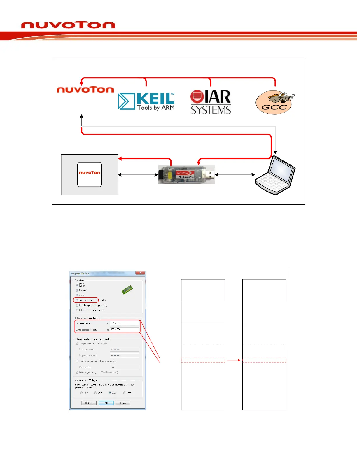 “Increased Serial Number (SN)” and “Write Address” to any of APROM, LDROM, and Data Flash, and
