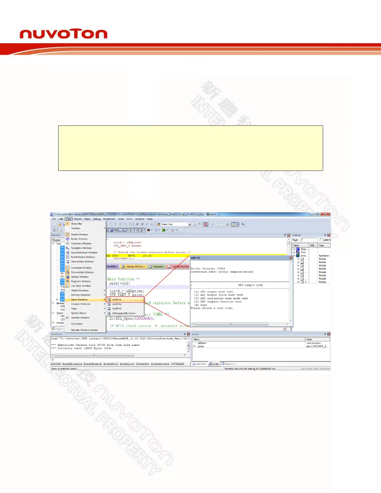 output through UART to the debug window by the Nu-Link Adapter. That is, the message is output