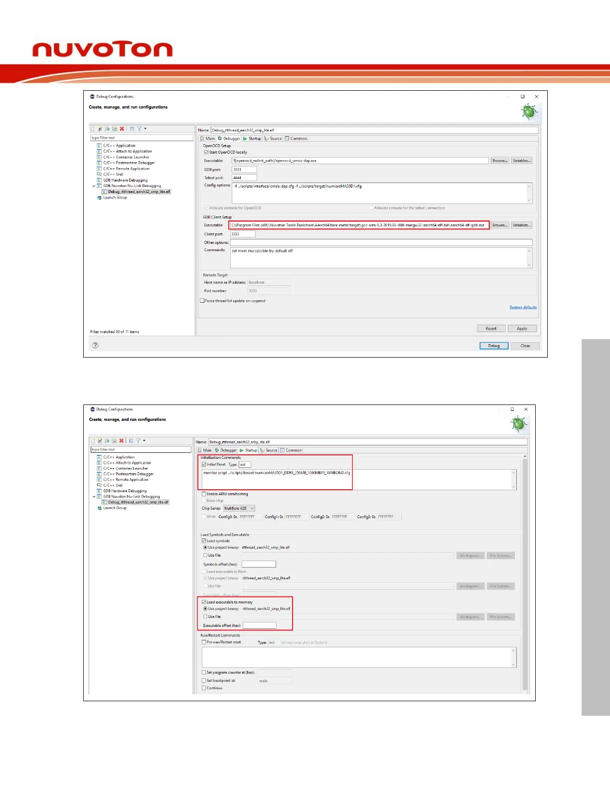 Nuvoton NuEclipse - Figure 4-40 Locating the AARCH64 GDB Executable; Figure 4-41 the First Time to Enter the Debug Mode Settings