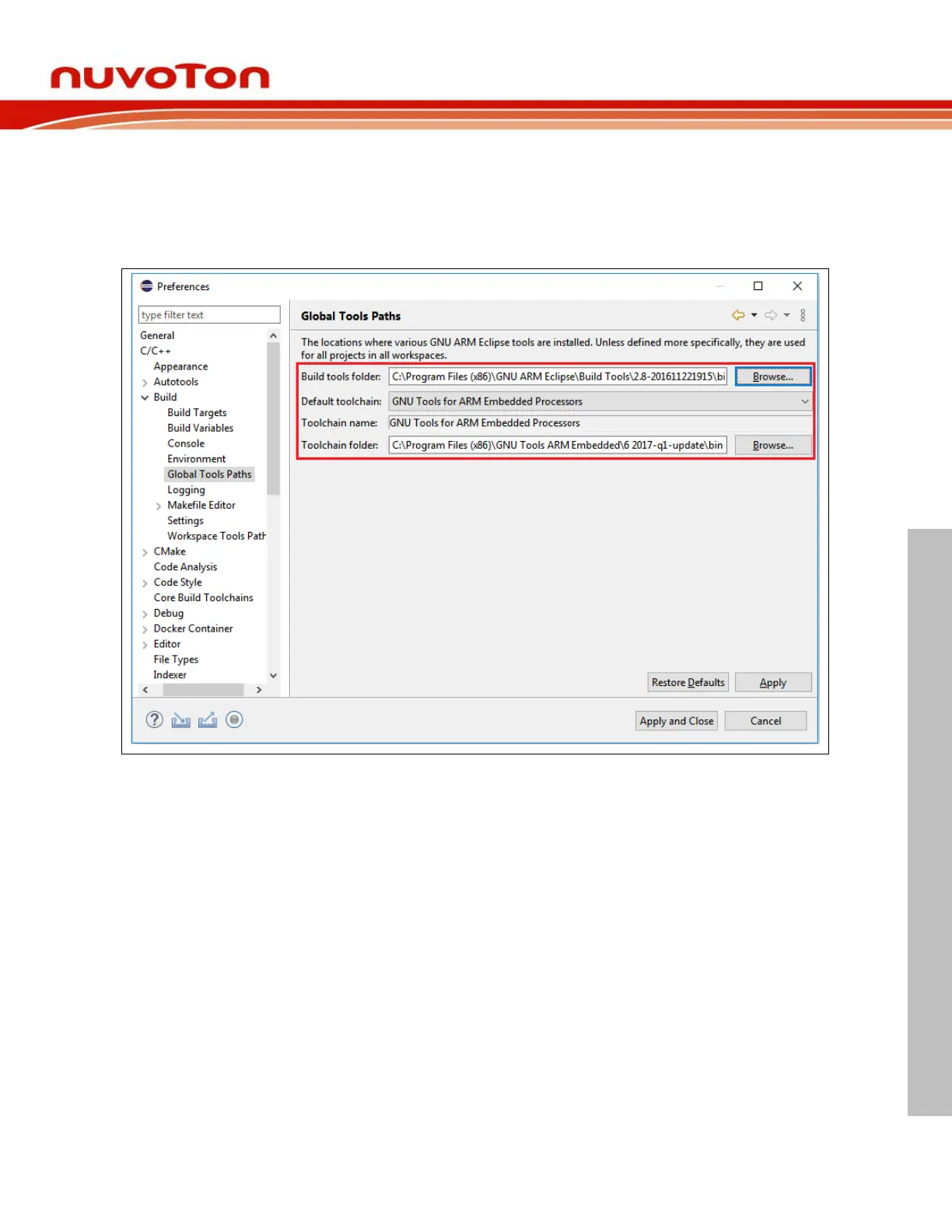 Window > Preferences, the Preferences wizard appears. Go to C/C++ > Build > Global Tools Paths