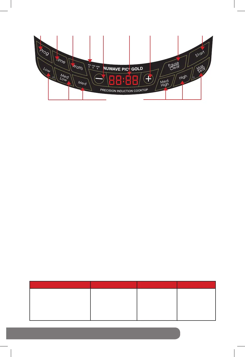 The default wattage of the PIC Gold is 2000 watts. To change the cooktop’s wattage, press “Watts”