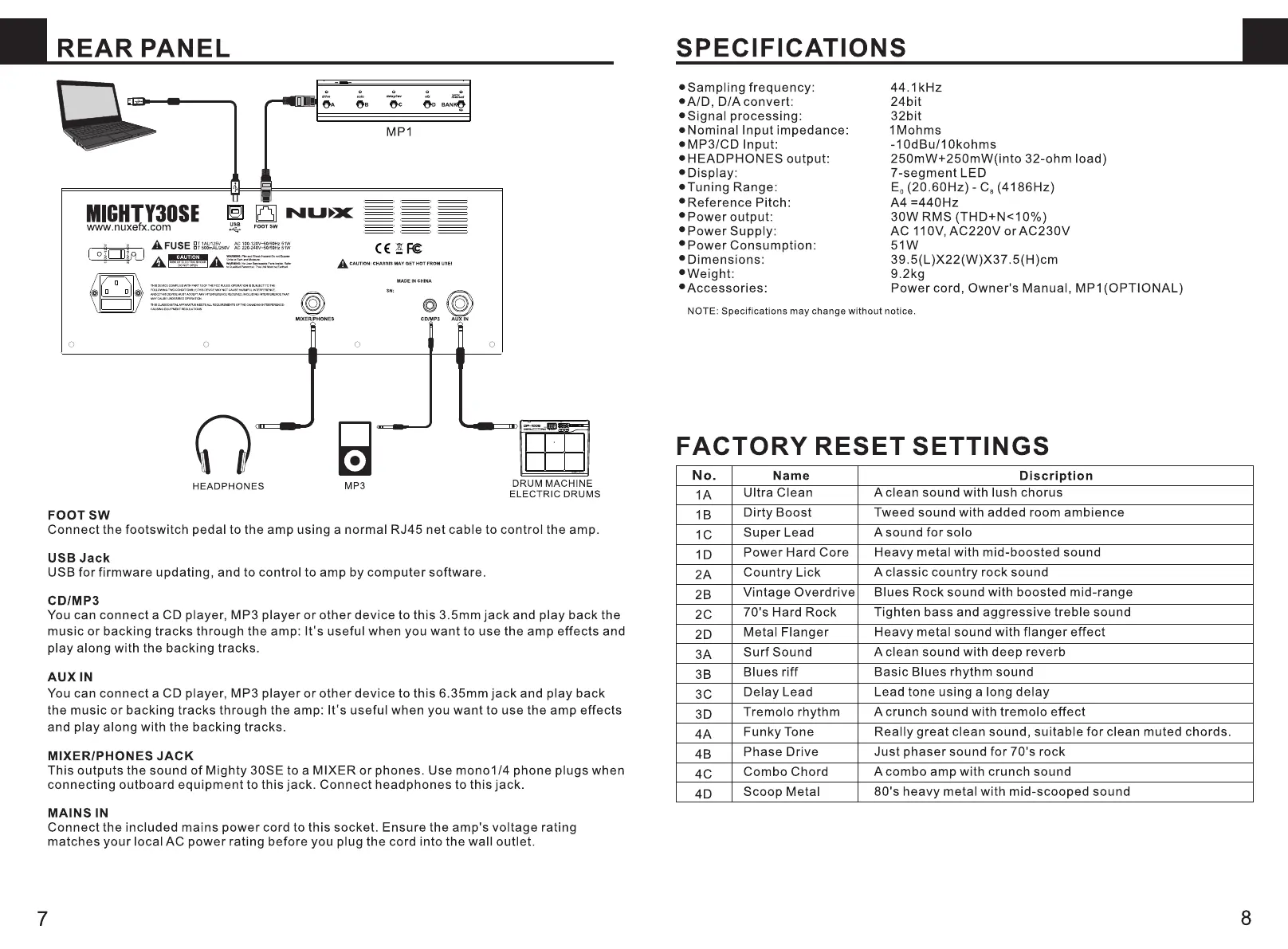 nux MIGHTY30SE - Rear Panel; Specifications; Factory Reset Settings; Foot SW