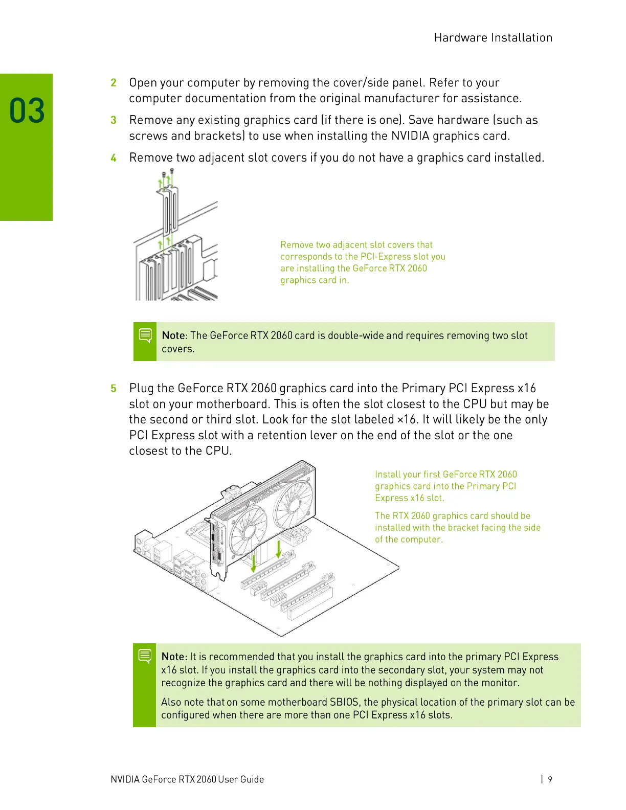 Note: The GeForce RTX 2060 card is double-wide and requires removing two slot