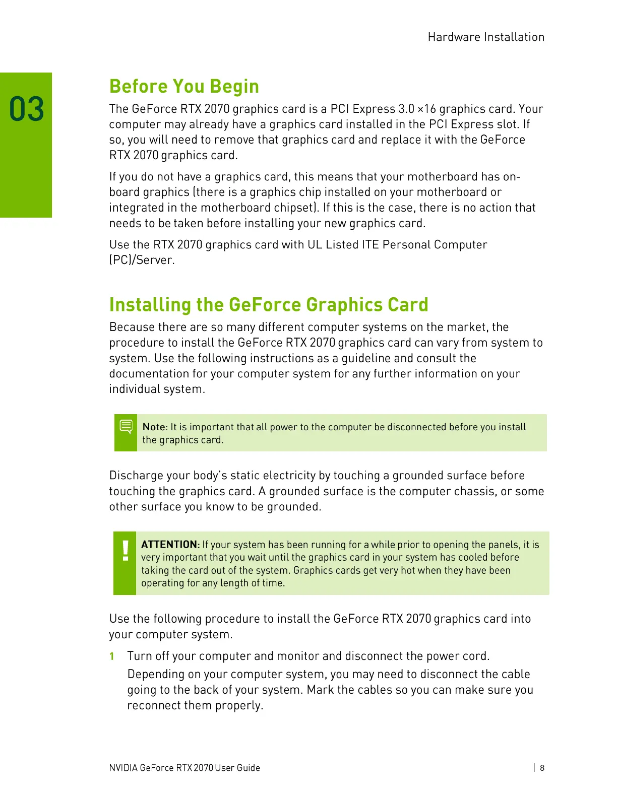 procedure to install the GeForce RTX 2070 graphics card can vary from system to