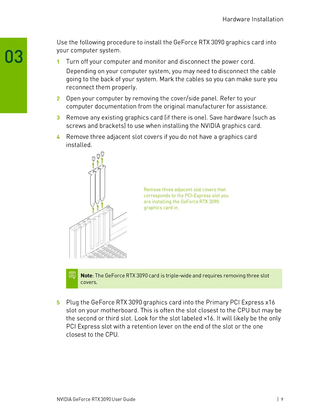 Note: The GeForce RTX 3090 card is triple-wide and requires removing three slot