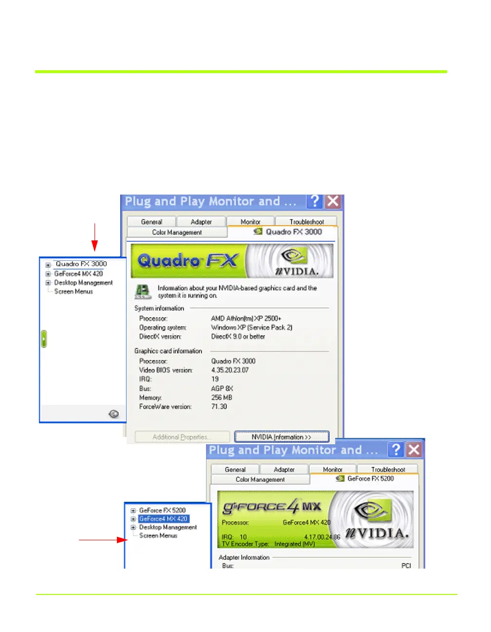 NVIDIA Display Menu — Quadro FX 3000 and GeForce4 MX 420 Options