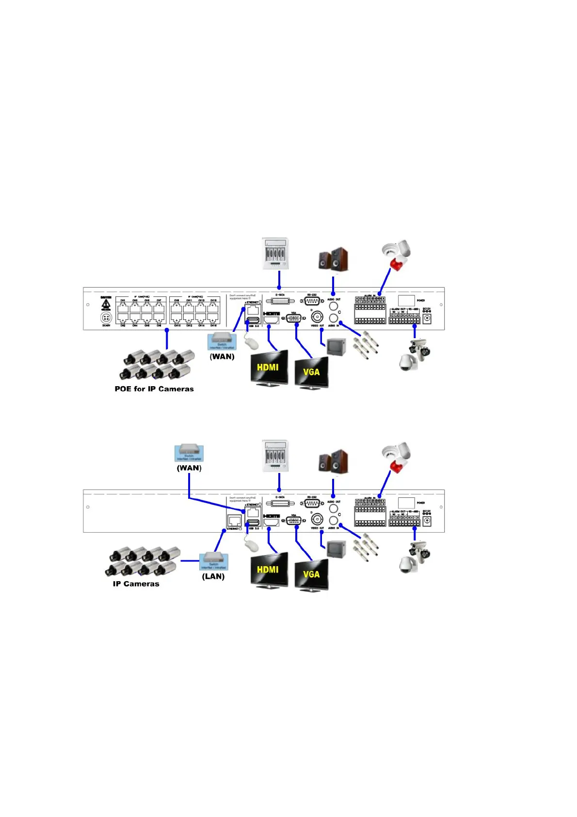 Connect the main monitor output connector (BNC/VGA/HDMI) to a surveillance TV/VGA