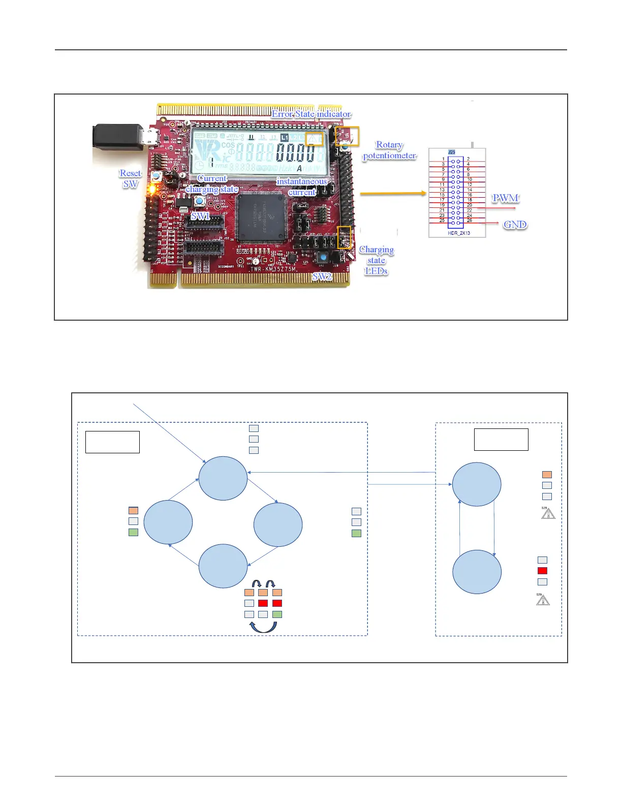 • Press SW2 to simulate the error and unknown error states. This changes the current charging state to 5 or 6, turns on the