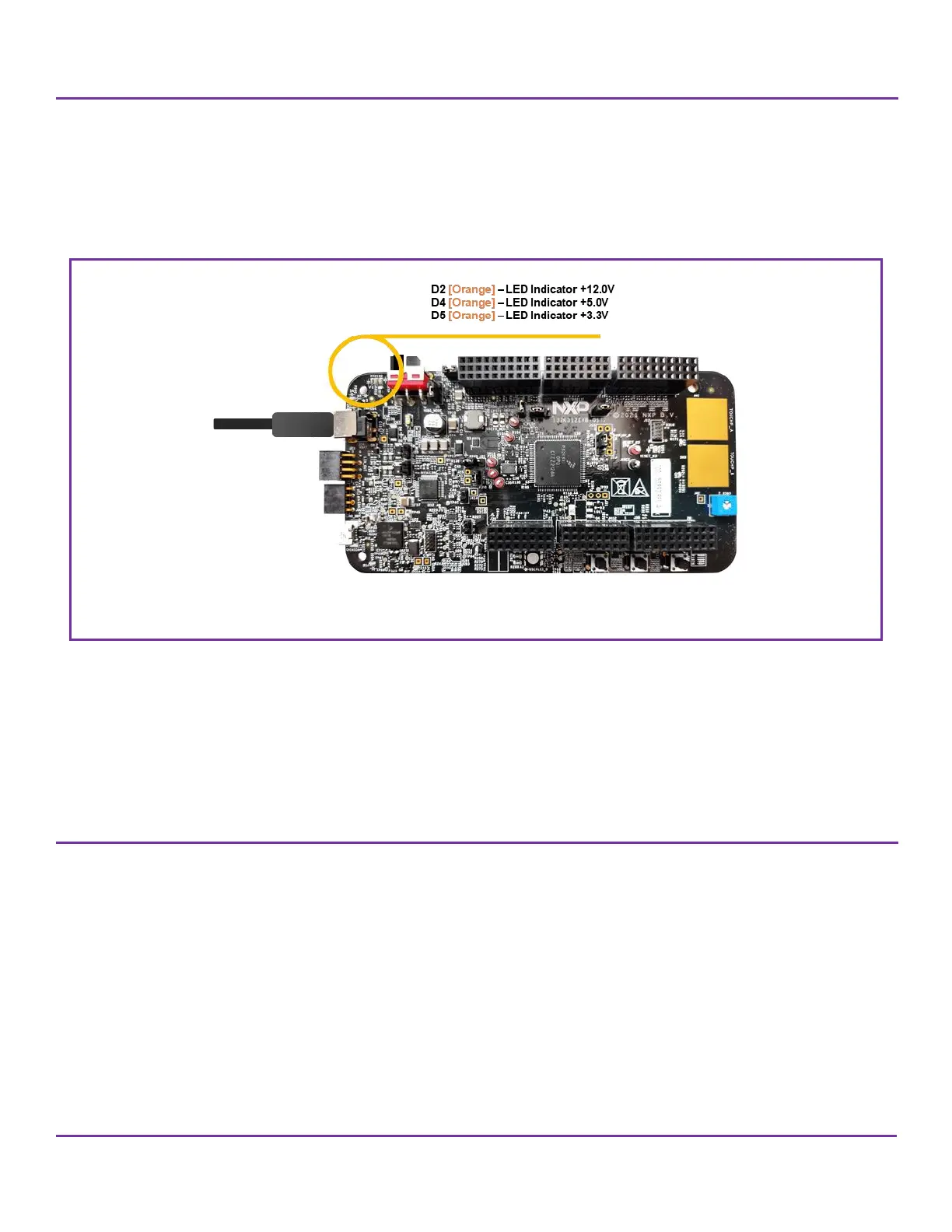 4. When power is applied to the EVB, three orange LED’s adjacent to the voltage regulators show the presence of the supply