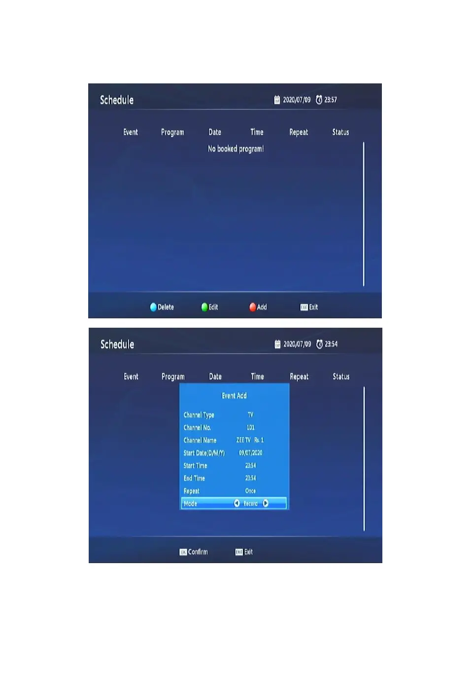 Press “EPG” from Remote to invoke guide. Press Yellow color button from remote to record/set