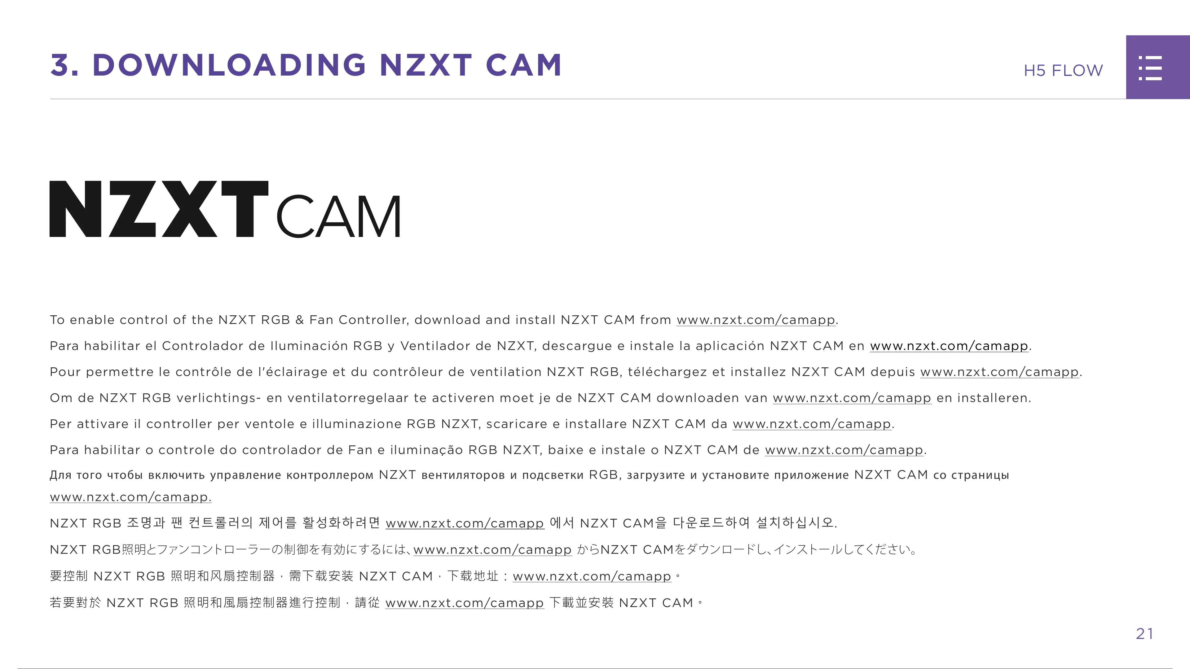 Para habilitar el Controlador de Iluminación RGB y Ventilador de NZXT, descargue e instale la aplicación NZXT CAM en www.nzxt.com/camapp.