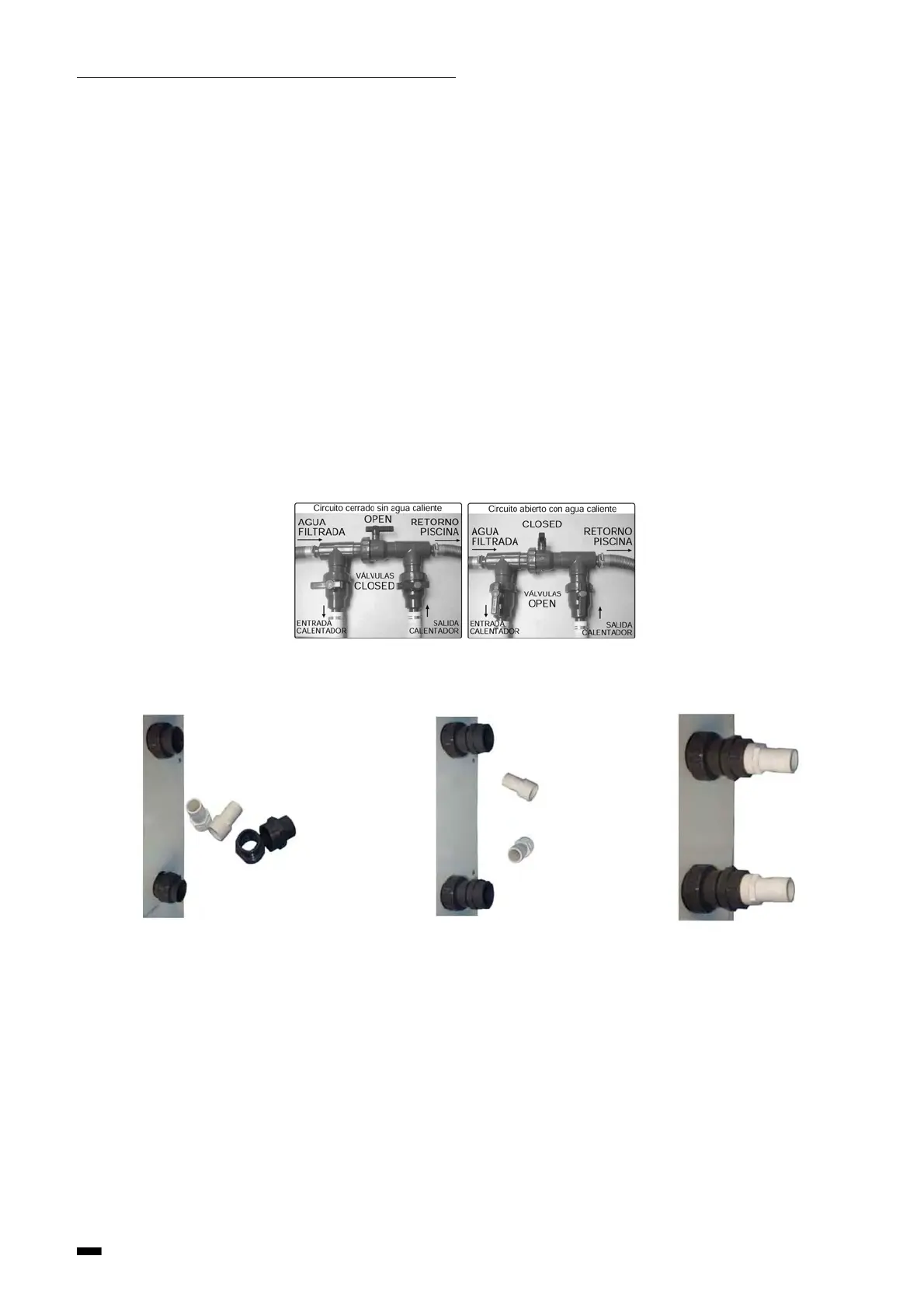 Conectar las entradas y las salidas de agua de la piscina de tubería de PVC 50/38 a la entrada y a la salida de la bomba de calor. La