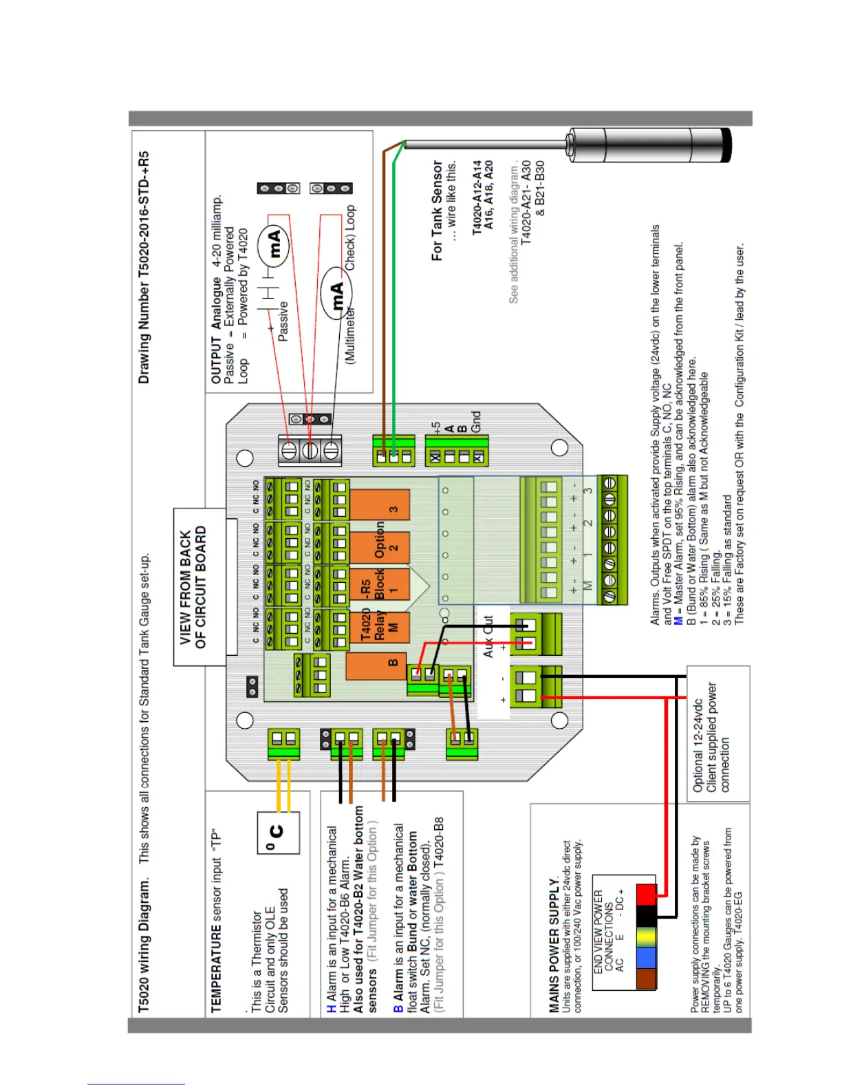 O.L.E. (UK) T4020 - Appendix 1: Wiring Diagram; Temperature Sensor Input Wiring; H Alarm Input Wiring; B Alarm Input Wiring