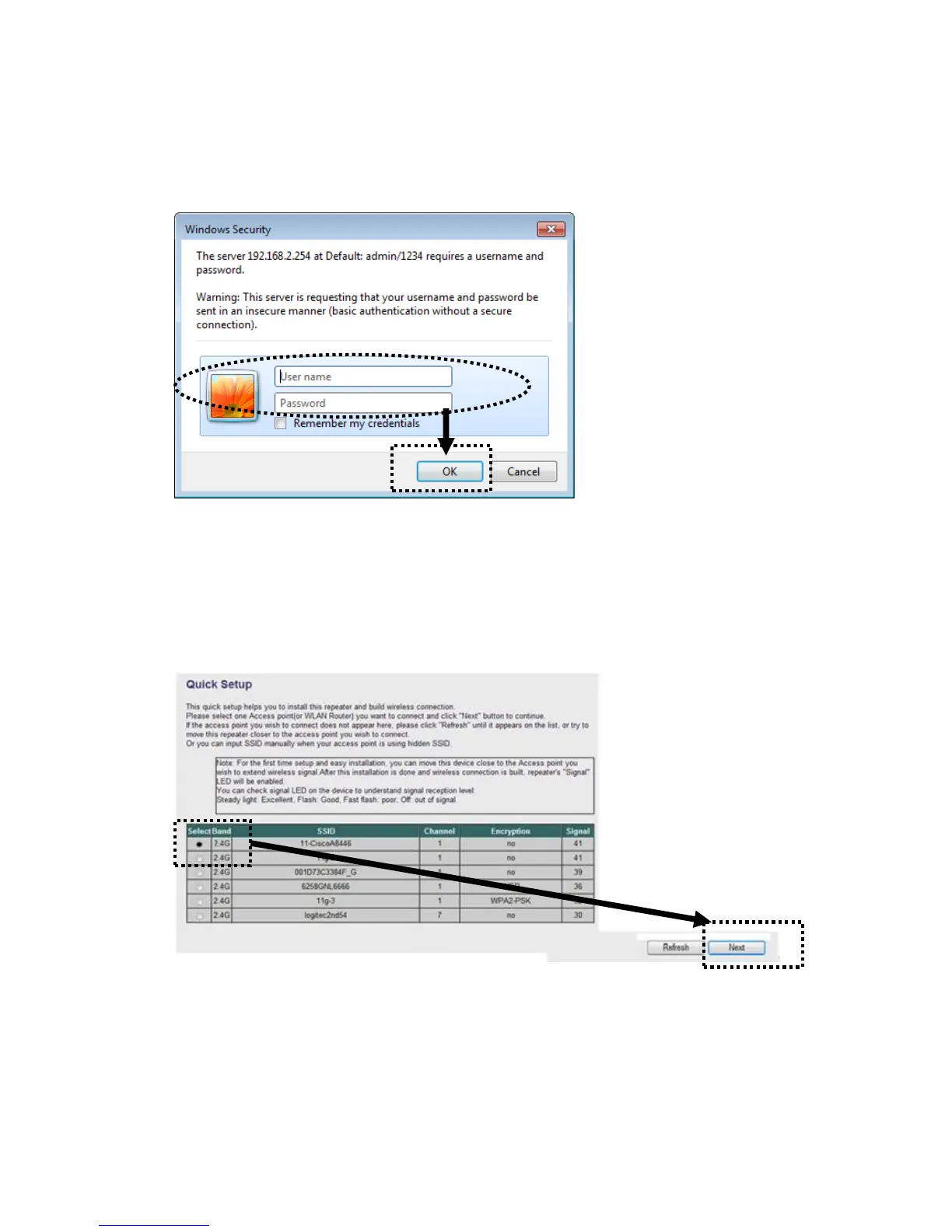 (3) Wireless repeater will prompt you to input username and password. Default
