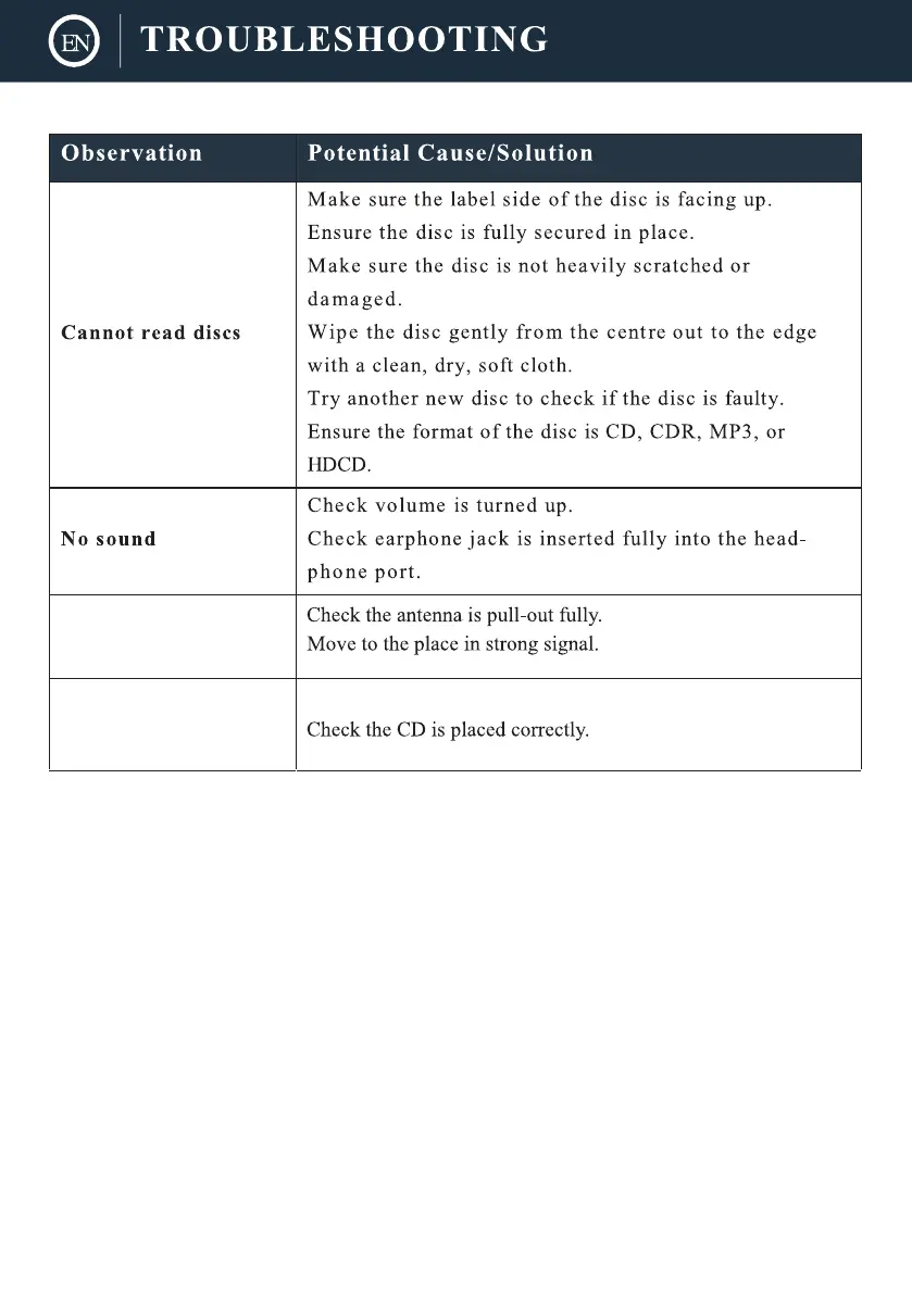 Oakcastle DAB400 - Troubleshooting; Cannot read discs; No sound; No sound on DAB;FM