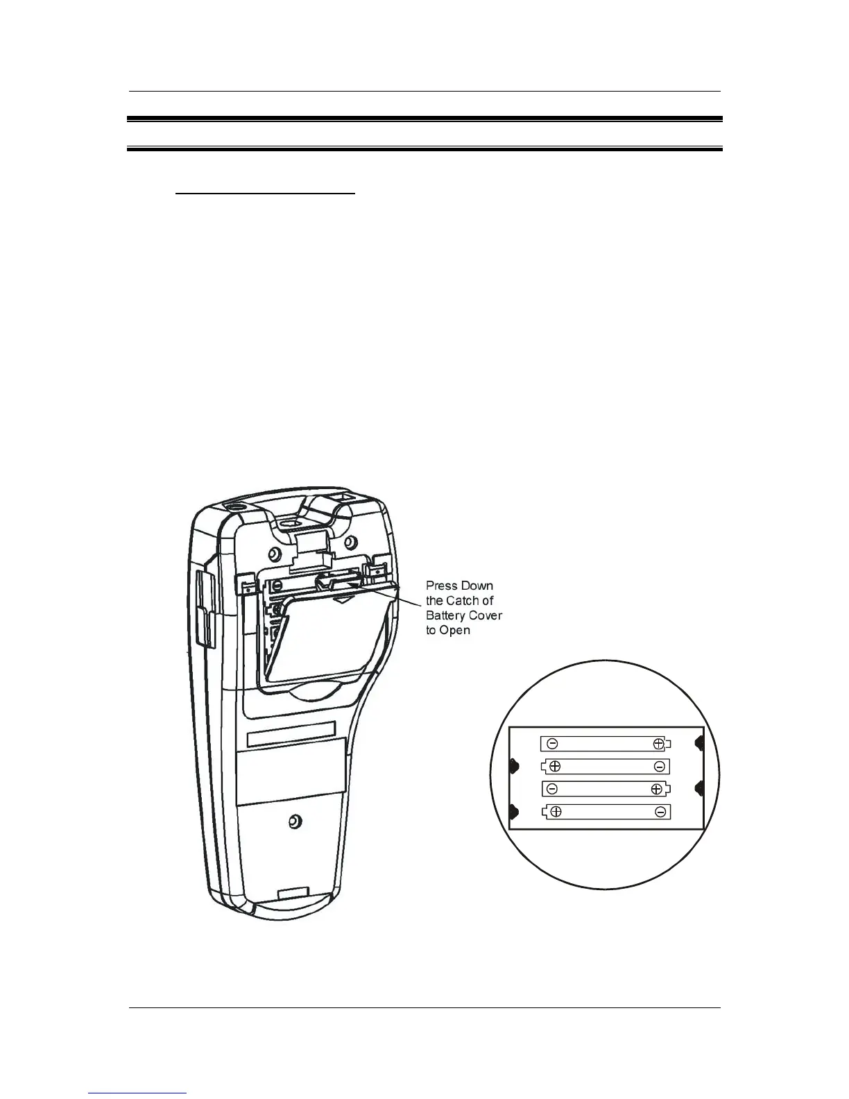 1. To open the battery compartment, press down the catch of the battery cover.