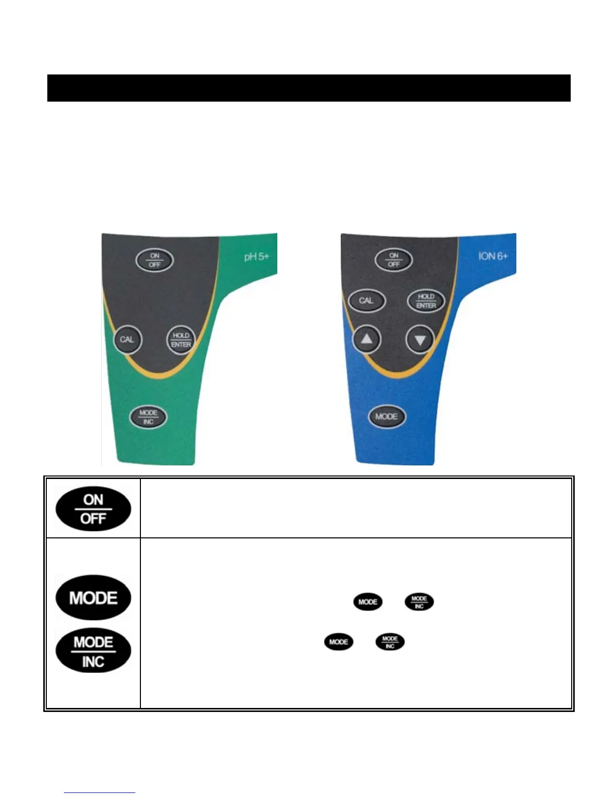 MODE: Selects measurement modes (pH, mV, Ion (Ion6+