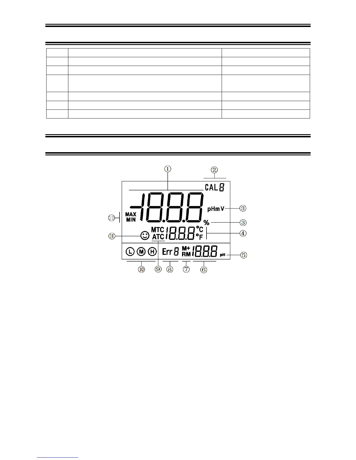 (6) — The pH value displayed during calibration, numberings for storage and recall, and reminder icons