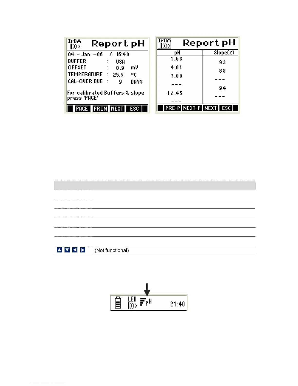 Function Keys available in pH calibration report screen: