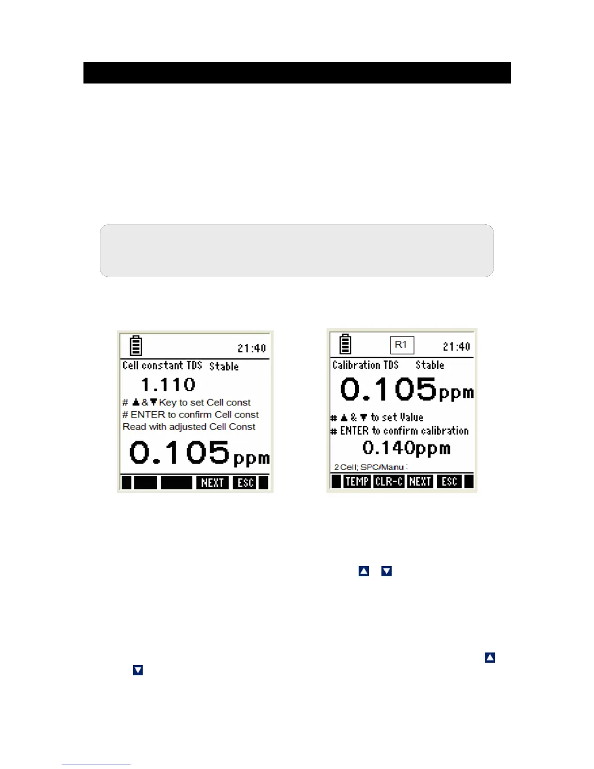 seconds and then shows the cell constant adjustment screen for TDS [Figure