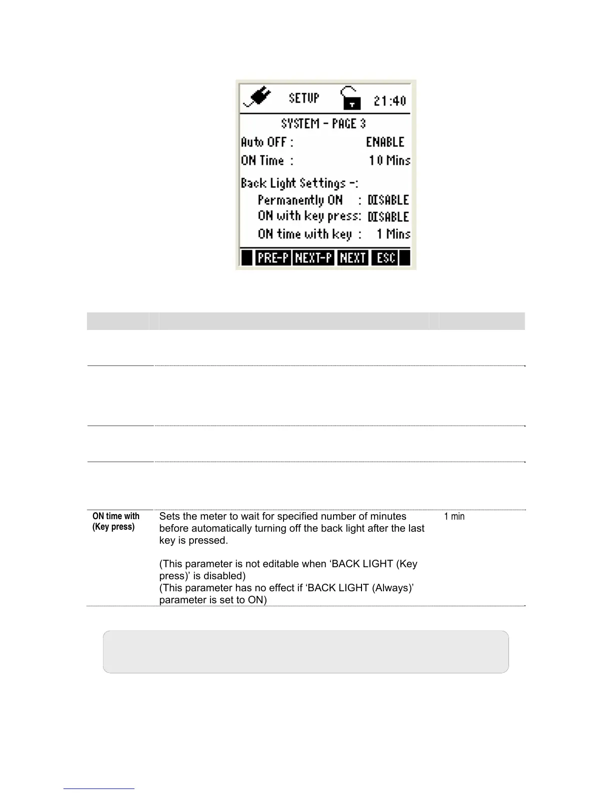 This page allows you to set auto-off and back light related parameters.