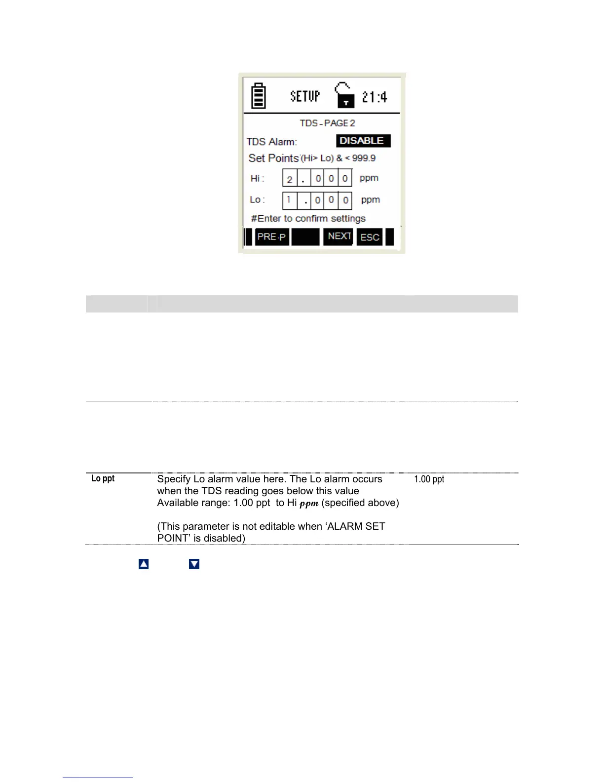 This page allows you to set alarm limits for the TDS measurement mode:
