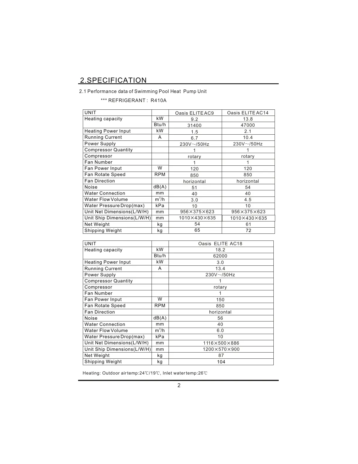 2.1 Performance data of Swimming Pool Heat Pump Unit