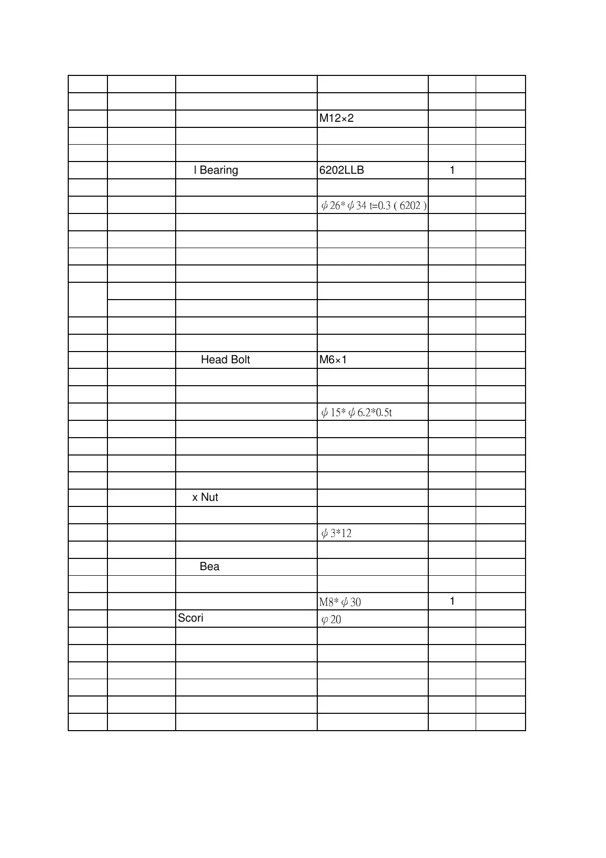 ITEM PART NO NOTE