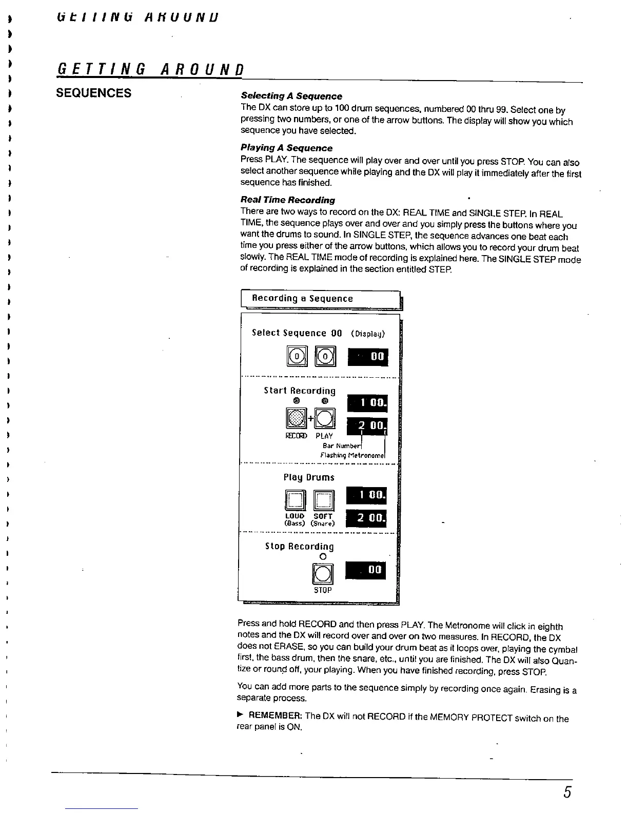 The DX can store up to 100 drum sequences. numbered 00 thru 99. Select one by