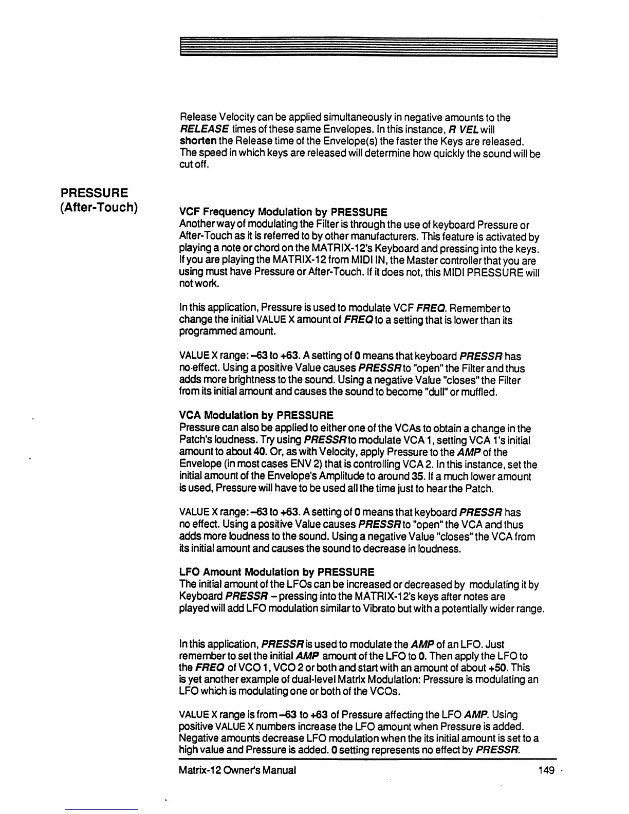 Oberheim Matrix-12 - Pressure - After-Touch; VCF Frequency Modulation by Pressure; VCA Modulation by Pressure; LFO Amount Modulation by Pressure