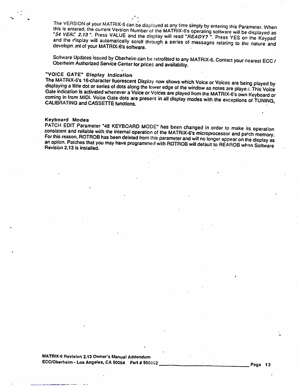 Oberheim Matrix-6 - CHANGES OF OPERATION; 54 SOFTWARE VERSION