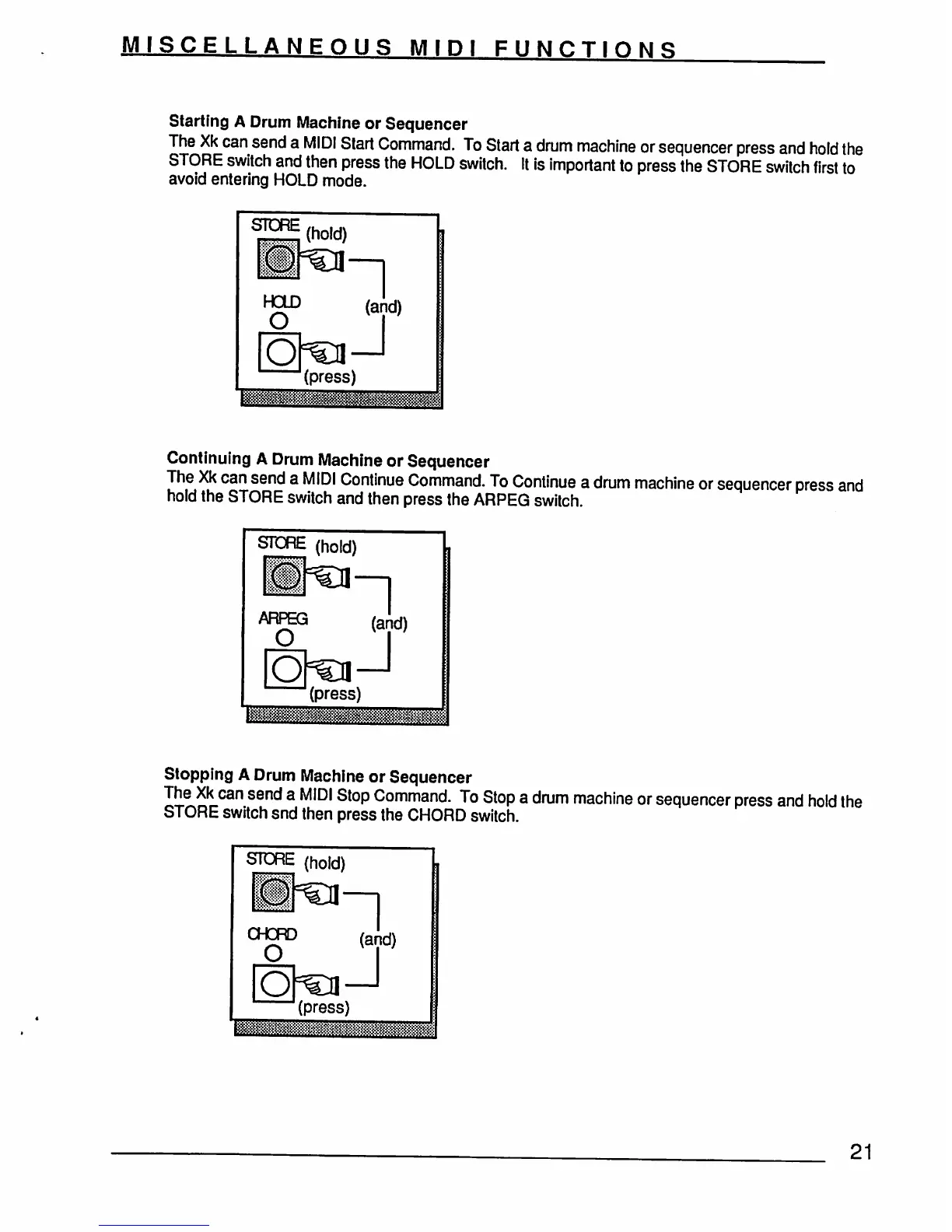 Oberheim XK - MISCELLANEOUS MIDI FUNCTIONS; Starting A Drum Machine or Sequencer; Continuing A Drum Machine or Sequencer; Stopping A Drum Machine or Sequencer