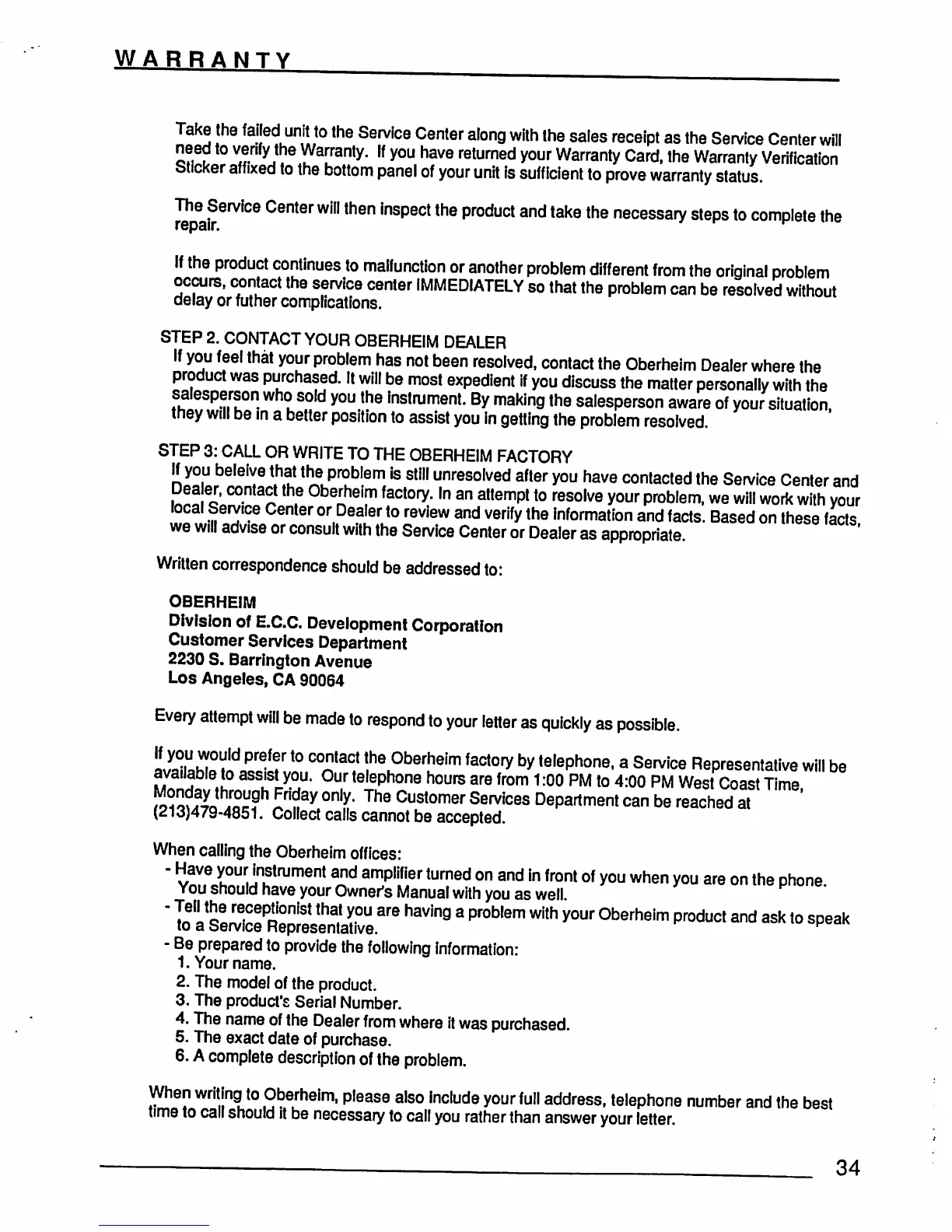 Oberheim XK - HOW TO OBTAIN WARRANTY SERVICE